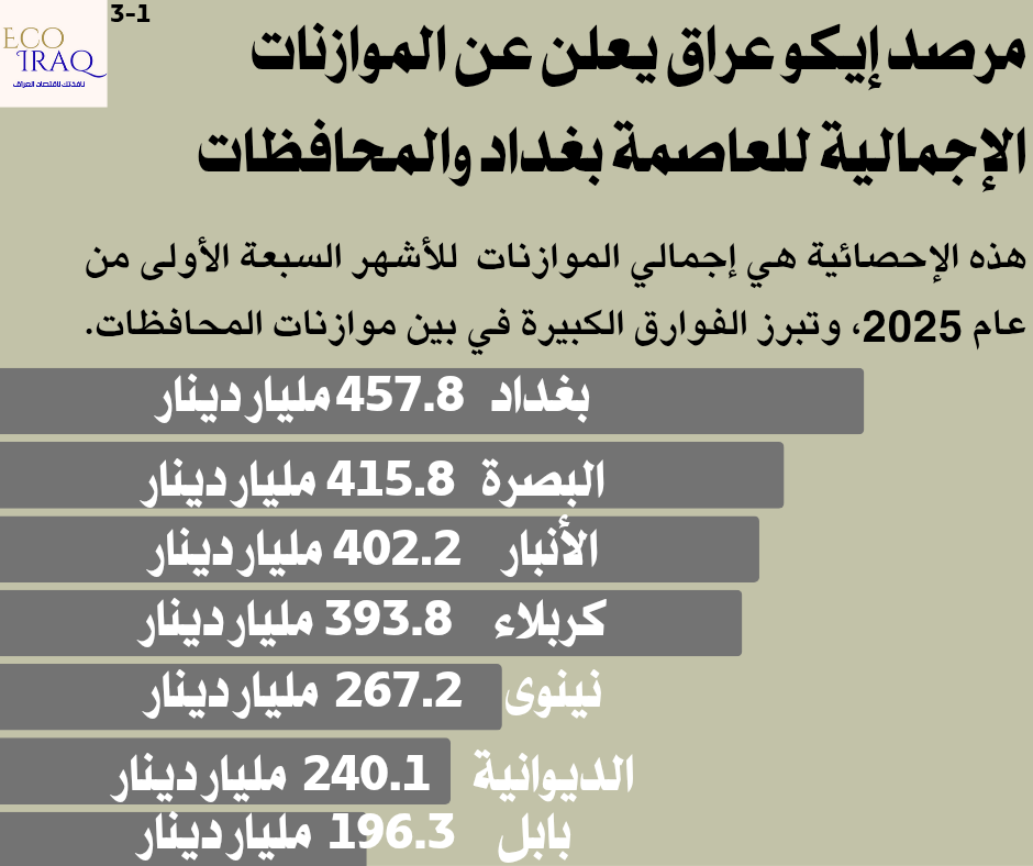 وقال المرصد في بيان صحفي إنّ "محافظة بغداد جاءت في المرتبة الأولى من حيث إجمالي الموازنة، إذ بلغت 457.8 مليار دينار عراقي، تلتها البصرة بـ 415.8 مليار دينار، ثم الأنبار بـ 402.2 مليار دينار، تليها كربلاء بـ 393.8 مليار دينار، ونينوى بـ 267.2 مليار دينار".