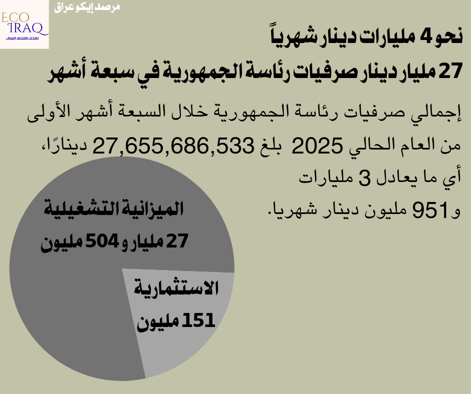كشف مرصد إيكو عراق أن الصرفيات الفعلية لرئاسة الجمهورية بلغت نحو 4 مليارات دينار شهريًا، حيث تمثل 99% منها نفقات تشغيلية (رواتب، سفر، مستلزمات إدارية وحماية)، فيما اشار إلى أن هذه المبالغ تصرف دون أن يقابلها أي نشاط تشريعي أو مشاريع تنفيذية بارزة.