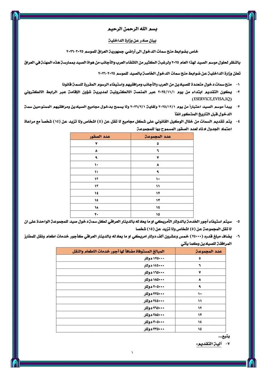 أعلنت وزارة الداخلية، عن ضوابط منح سمات الدخول لموسم الصيد 2025- 2026، والرسوم المالية المترتبة عليها، وذلك بعد ساعات من اعتقال مجموعة صيادين عرب في بادية المثنى.