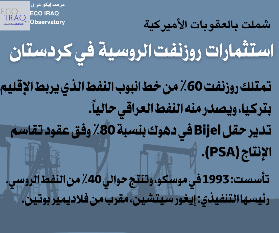 كشف مرصد إيكو عراق، عن امتلاك شركة روزنفت الروسية المشمولة بالعقوبات الأميركية، 60% من انبوب الكردي الذي ينقل خلاله النفط العراقي لميناء جيهان التركي.