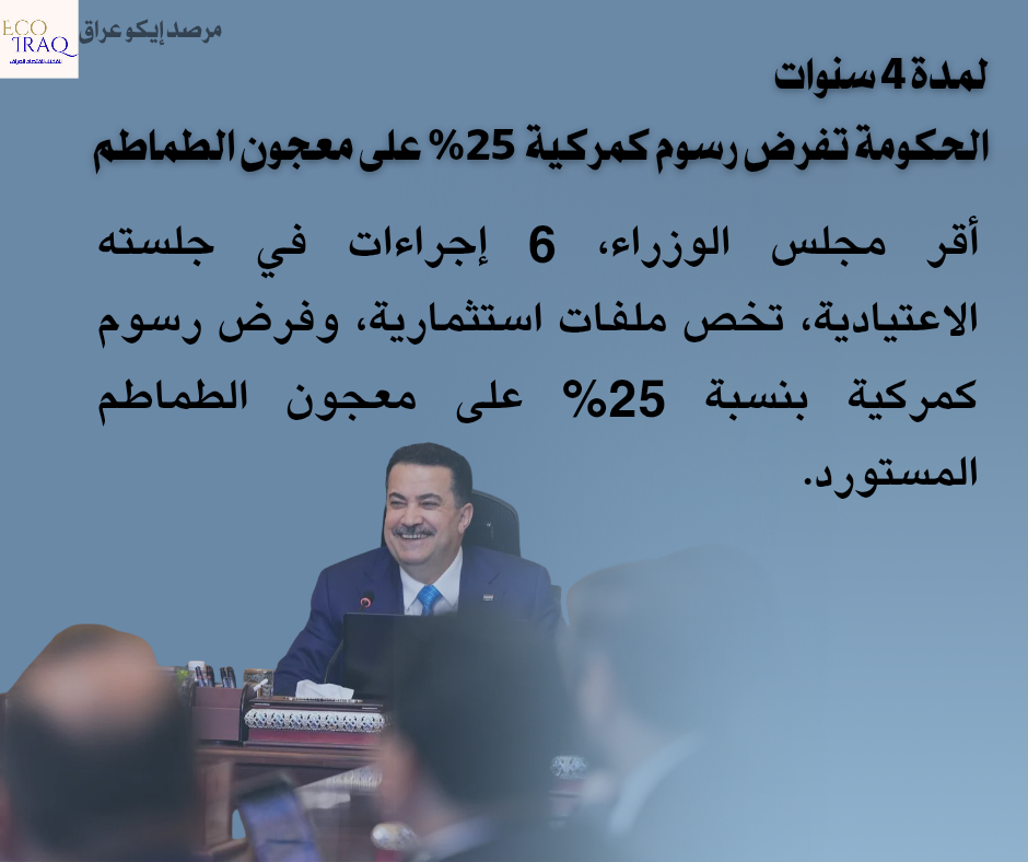 أقر مجلس الوزراء، يوم الخميس، 6 إجراءات في جلسته الاعتيادية، ومنها فرض رسوم كمركية بنسبة 25% على معجنون الطماطم المستورد...